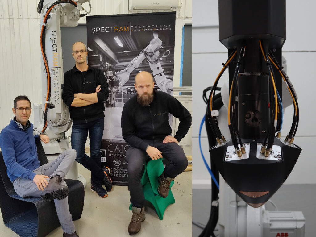 Spectram är en del av Spectrum Technology som utvecklar och bygger kundanpassade industriella robotlösningar för additiv tillverkning. Fördelarna med att knyta samman dessa system är bland annat möjligheten att printa stort med en 6-axlig robot och designfriheten som det innebär. Dessutom krävs inga stödmaterial.