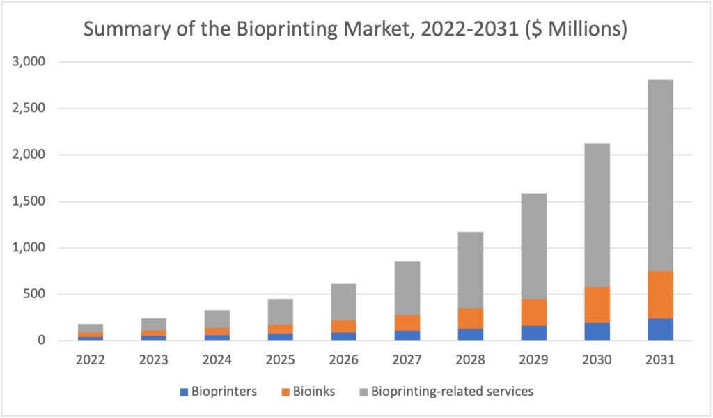 Siffrorna är hämtade från en färsk rapport av analysföretaget SmarTech Analysis, som för tredje gången ger ut ”Bioprinting: Markets and Opportunities”. Rapporten omfattar biobläck, bioprinting-relaterade tjänster och själva 3D-bioskrivarna.