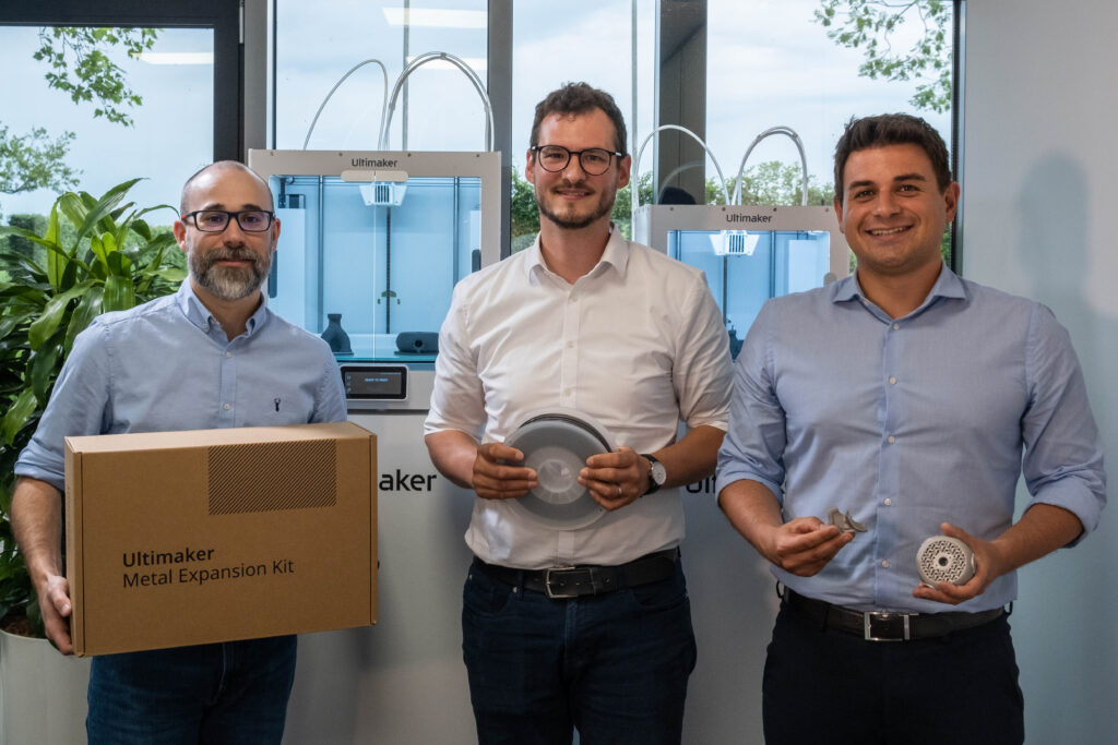 Från vänster: Miguel Calvo (CTO Ultimaker), Tobias Rödlmeier (Business Development Manager – Metal Ecosystem at BASF Forward AM), Andrea Gasperini (Product Manager Ultimaker) med ett Ultimaker Metal Expansion Kit i samband med lanseringen sommaren 2022. Foto: Pressbild