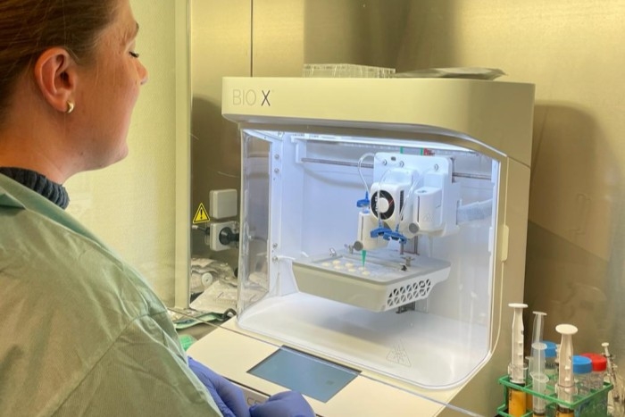 Verksamhet Plastikkirurgi inleder nu försök med att sätta in bioprintade implantat på människa. På bilden syns doktorand Kristin Oskarsdottir med en BioX-printer från Cellink. Foto: Sahlgrenska Universitetssjukhuset